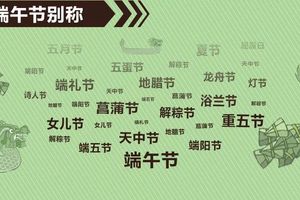 端午节别称最多,除了我们熟知的端阳、五月节、重五节、龙舟节、粽子节外,还有浴兰节、女儿节、天中节、诗人节、龙日等多达二十多种别称。