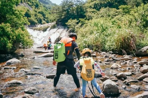 溪谷溪流湿滑难行,建议穿着速干衣裤、专业户外溯溪鞋(包头、防滑、排水、速干),配备防水背包。